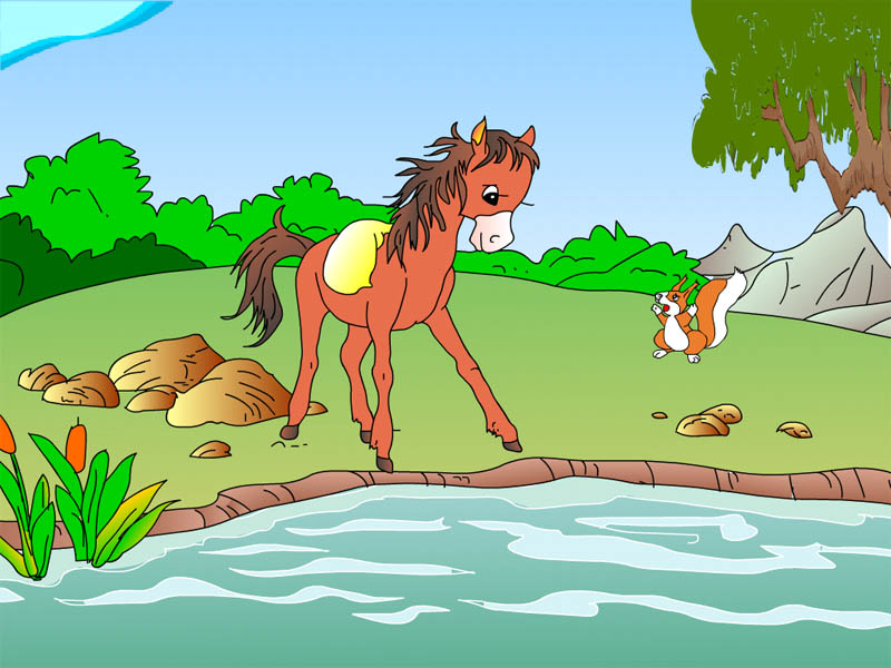The colt was crossing the river when a squirrel jumped down a tree and stopped him. The squirrel shouted, "Colt, stop! You'll drown! One of my friends drowned just yesterday in the river." Not knowing what to do, the colt went home to consult his mom.