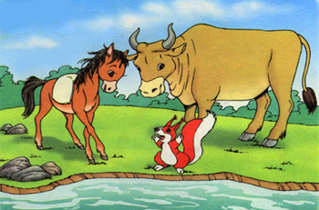 She was running with the bag on his back, he came to a small river. The colt could not decide whether he could cross it. Looking around, he saw a cow grazing nearby. He asked, "Aunt Cow, could you tell me if I can cross the river?" The cow told him that he could and that the river was not very deep, just knee high.